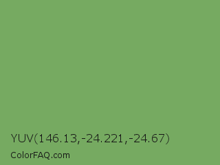 YUV 146.13,-24.221,-24.67 Color is a normal green color and the nearest color is Asparagus Green #7ba05b. Hex code #76aa61 and RGB value is rgb(118,170,97). In RGB color space, this color is composed of 46% red, 67% green, 38% blue, In CMYK color space, this color is composed of 31% cyan, 0% magenta, 43% yellow , 33% black , In HSL color space, this color has a hue angle of 103° , 30% saturation and 52% lightness.