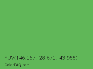 YUV 146.157,-28.671,-43.988 Color is a normal green color and the nearest color is Fern #63b76c. Hex code #60b758 and RGB value is rgb(96,183,88). In RGB color space, this color is composed of 38% red, 72% green, 35% blue, In CMYK color space, this color is composed of 48% cyan, 0% magenta, 52% yellow , 28% black , In HSL color space, this color has a hue angle of 115° , 40% saturation and 53% lightness.