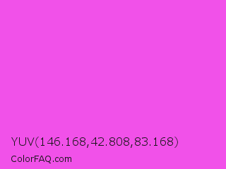 YUV 146.168,42.808,83.168 Color is a light magenta color and the nearest color is Purple Pizzazz #fe4eda. Hex code #f151e9 and RGB value is rgb(241,81,233). In RGB color space, this color is composed of 95% red, 32% green, 91% blue, In CMYK color space, this color is composed of 0% cyan, 66% magenta, 3% yellow , 5% black , In HSL color space, this color has a hue angle of 303° , 85% saturation and 63% lightness.