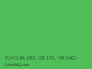 YUV 146.183,-28.191,-58.042 Color is a normal green color and the nearest color is Fern #63b76c. Hex code #50bf59 and RGB value is rgb(80,191,89). In RGB color space, this color is composed of 31% red, 75% green, 35% blue, In CMYK color space, this color is composed of 58% cyan, 0% magenta, 53% yellow , 25% black , In HSL color space, this color has a hue angle of 125° , 46% saturation and 53% lightness.