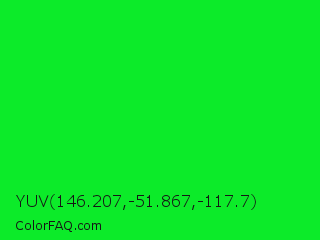 YUV 146.207,-51.867,-117.7 Color is a normal green color and the nearest color is Vivid Malachite #00cc33. Hex code #0ceb29 and RGB value is rgb(12,235,41). In RGB color space, this color is composed of 5% red, 92% green, 16% blue, In CMYK color space, this color is composed of 95% cyan, 0% magenta, 83% yellow , 8% black , In HSL color space, this color has a hue angle of 128° , 90% saturation and 48% lightness.