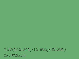 YUV 146.241,-15.895,-35.291 Color is a normal green color and the nearest color is Aqua Forest #5fa777. Hex code #6aad72 and RGB value is rgb(106,173,114). In RGB color space, this color is composed of 42% red, 68% green, 45% blue, In CMYK color space, this color is composed of 39% cyan, 0% magenta, 34% yellow , 32% black , In HSL color space, this color has a hue angle of 127° , 29% saturation and 55% lightness.