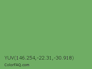 YUV 146.254,-22.31,-30.918 Color is a normal green color and the nearest color is Bud Green #7bb661. Hex code #6fad65 and RGB value is rgb(111,173,101). In RGB color space, this color is composed of 44% red, 68% green, 40% blue, In CMYK color space, this color is composed of 36% cyan, 0% magenta, 42% yellow , 32% black , In HSL color space, this color has a hue angle of 112° , 31% saturation and 54% lightness.