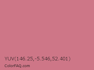YUV 146.25,-5.546,52.401 Color is a light red color and the nearest color is Charm #d47494. Hex code #ce7687 and RGB value is rgb(206,118,135). In RGB color space, this color is composed of 81% red, 46% green, 53% blue, In CMYK color space, this color is composed of 0% cyan, 43% magenta, 34% yellow , 19% black , In HSL color space, this color has a hue angle of 348° , 47% saturation and 64% lightness.