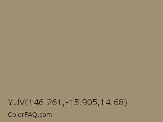 YUV 146.261,-15.905,14.68 Color is a normal orange color and the nearest color is Donkey Brown #a69279. Hex code #a39072 and RGB value is rgb(163,144,114). In RGB color space, this color is composed of 64% red, 56% green, 45% blue, In CMYK color space, this color is composed of 0% cyan, 12% magenta, 30% yellow , 36% black , In HSL color space, this color has a hue angle of 37° , 21% saturation and 54% lightness.