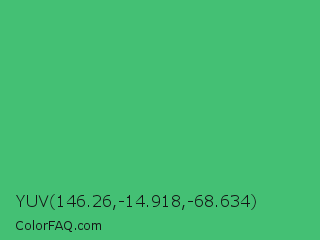 YUV 146.26,-14.918,-68.634 Color is a normal green color and the nearest color is Emerald #50c878. Hex code #44c074 and RGB value is rgb(68,192,116). In RGB color space, this color is composed of 27% red, 75% green, 45% blue, In CMYK color space, this color is composed of 65% cyan, 0% magenta, 40% yellow , 25% black , In HSL color space, this color has a hue angle of 143° , 50% saturation and 51% lightness.