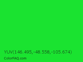 YUV 146.495,-48.558,-105.674 Color is a normal green color and the nearest color is Lime Green #32cd32. Hex code #1ae330 and RGB value is rgb(26,227,48). In RGB color space, this color is composed of 10% red, 89% green, 19% blue, In CMYK color space, this color is composed of 89% cyan, 0% magenta, 79% yellow , 11% black , In HSL color space, this color has a hue angle of 127° , 79% saturation and 50% lightness.
