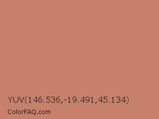 YUV 146.536,-19.491,45.134 Color is a normal red color and the nearest color is Antique Brass #c88a65. Hex code #c6806b and RGB value is rgb(198,128,107). In RGB color space, this color is composed of 78% red, 50% green, 42% blue, In CMYK color space, this color is composed of 0% cyan, 35% magenta, 46% yellow , 22% black , In HSL color space, this color has a hue angle of 14° , 44% saturation and 60% lightness.