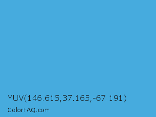 YUV 146.615,37.165,-67.191 Color is a normal blue color and the nearest color is Picton Blue #45b1e8. Hex code #46abde and RGB value is rgb(70,171,222). In RGB color space, this color is composed of 27% red, 67% green, 87% blue, In CMYK color space, this color is composed of 68% cyan, 23% magenta, 0% yellow , 13% black , In HSL color space, this color has a hue angle of 200° , 70% saturation and 57% lightness.