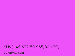 YUV 146.622,50.965,80.139 Color is a light magenta color and the nearest color is Pink Flamingo Crayola #ff66ff. Hex code #ee50fa and RGB value is rgb(238,80,250). In RGB color space, this color is composed of 93% red, 31% green, 98% blue, In CMYK color space, this color is composed of 5% cyan, 68% magenta, 0% yellow , 2% black , In HSL color space, this color has a hue angle of 296° , 94% saturation and 65% lightness.