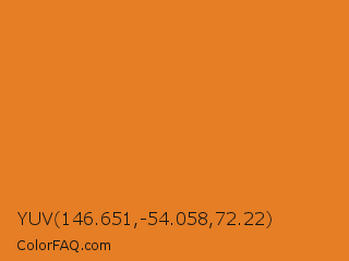 YUV 146.651,-54.058,72.22 Color is a normal orange color and the nearest color is Zest #e5841b. Hex code #e57e25 and RGB value is rgb(229,126,37). In RGB color space, this color is composed of 90% red, 49% green, 15% blue, In CMYK color space, this color is composed of 0% cyan, 45% magenta, 84% yellow , 10% black , In HSL color space, this color has a hue angle of 28° , 79% saturation and 52% lightness.