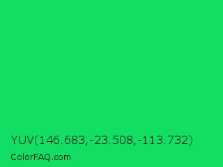 YUV 146.683,-23.508,-113.732 Color is a normal green color and the nearest color is Malachite #0bda51. Hex code #11de63 and RGB value is rgb(17,222,99). In RGB color space, this color is composed of 7% red, 87% green, 39% blue, In CMYK color space, this color is composed of 92% cyan, 0% magenta, 55% yellow , 13% black , In HSL color space, this color has a hue angle of 144° , 86% saturation and 47% lightness.