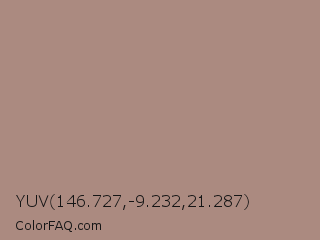 YUV 146.727,-9.232,21.287 Color is a normal red color and the nearest color is Sandrift #ab917a. Hex code #ab8a80 and RGB value is rgb(171,138,128). In RGB color space, this color is composed of 67% red, 54% green, 50% blue, In CMYK color space, this color is composed of 0% cyan, 19% magenta, 25% yellow , 33% black , In HSL color space, this color has a hue angle of 14° , 20% saturation and 59% lightness.