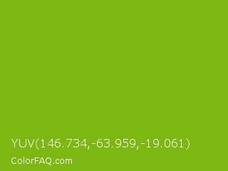 YUV 146.734,-63.959,-19.061 Color is a normal green color and the nearest color is Lima #76bd17. Hex code #7db711 and RGB value is rgb(125,183,17). In RGB color space, this color is composed of 49% red, 72% green, 7% blue, In CMYK color space, this color is composed of 32% cyan, 0% magenta, 91% yellow , 28% black , In HSL color space, this color has a hue angle of 81° , 83% saturation and 39% lightness.