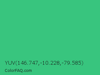 YUV 146.747,-10.228,-79.585 Color is a normal green color and the nearest color is UFO Green #3cd070. Hex code #38c57e and RGB value is rgb(56,197,126). In RGB color space, this color is composed of 22% red, 77% green, 49% blue, In CMYK color space, this color is composed of 72% cyan, 0% magenta, 36% yellow , 23% black , In HSL color space, this color has a hue angle of 150° , 56% saturation and 50% lightness.