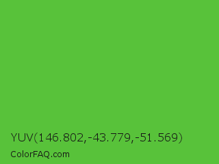YUV 146.802,-43.779,-51.569 Color is a normal green color and the nearest color is Green RYB #66b032. Hex code #58c23a and RGB value is rgb(88,194,58). In RGB color space, this color is composed of 35% red, 76% green, 23% blue, In CMYK color space, this color is composed of 55% cyan, 0% magenta, 70% yellow , 24% black , In HSL color space, this color has a hue angle of 107° , 54% saturation and 49% lightness.