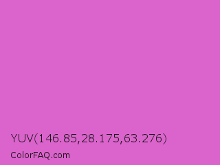 YUV 146.85,28.175,63.276 Color is a light magenta color and the nearest color is Orchid #da70d6. Hex code #db63cc and RGB value is rgb(219,99,204). In RGB color space, this color is composed of 86% red, 39% green, 80% blue, In CMYK color space, this color is composed of 0% cyan, 55% magenta, 7% yellow , 14% black , In HSL color space, this color has a hue angle of 308° , 63% saturation and 62% lightness.