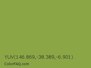 YUV 146.869,-38.389,-6.901 Color is a normal lime color and the nearest color is Sushi #87ab39. Hex code #8ba645 and RGB value is rgb(139,166,69). In RGB color space, this color is composed of 55% red, 65% green, 27% blue, In CMYK color space, this color is composed of 16% cyan, 0% magenta, 58% yellow , 35% black , In HSL color space, this color has a hue angle of 77° , 41% saturation and 46% lightness.