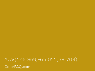 YUV 146.869,-65.011,38.703 Color is a normal yellow color and the nearest color is Pizza #c99415. Hex code #bf960f and RGB value is rgb(191,150,15). In RGB color space, this color is composed of 75% red, 59% green, 6% blue, In CMYK color space, this color is composed of 0% cyan, 21% magenta, 92% yellow , 25% black , In HSL color space, this color has a hue angle of 46° , 85% saturation and 40% lightness.