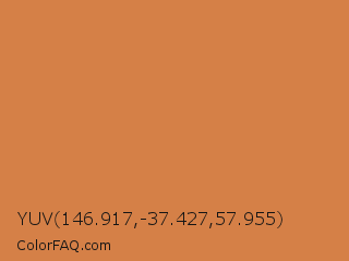 YUV 146.917,-37.427,57.955 Color is a normal orange color and the nearest color is Raw Sienna Crayola #d27d46. Hex code #d58047 and RGB value is rgb(213,128,71). In RGB color space, this color is composed of 84% red, 50% green, 28% blue, In CMYK color space, this color is composed of 0% cyan, 40% magenta, 67% yellow , 16% black , In HSL color space, this color has a hue angle of 24° , 63% saturation and 56% lightness.