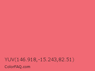 YUV 146.918,-15.243,82.51 Color is a light red color and the nearest color is Begonia #fa6e79. Hex code #f16974 and RGB value is rgb(241,105,116). In RGB color space, this color is composed of 95% red, 41% green, 45% blue, In CMYK color space, this color is composed of 0% cyan, 56% magenta, 52% yellow , 5% black , In HSL color space, this color has a hue angle of 355° , 83% saturation and 68% lightness.
