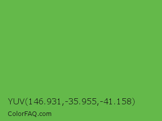 YUV 146.931,-35.955,-41.158 Color is a normal green color and the nearest color is Green RYB #66b032. Hex code #64b94a and RGB value is rgb(100,185,74). In RGB color space, this color is composed of 39% red, 73% green, 29% blue, In CMYK color space, this color is composed of 46% cyan, 0% magenta, 60% yellow , 27% black , In HSL color space, this color has a hue angle of 106° , 44% saturation and 51% lightness.