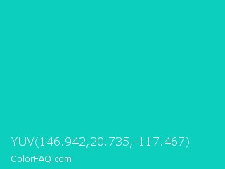 YUV 146.942,20.735,-117.467 Color is a normal cyan color and the nearest color is Robins Egg Blue #00cccc. Hex code #0dcfbd and RGB value is rgb(13,207,189). In RGB color space, this color is composed of 5% red, 81% green, 74% blue, In CMYK color space, this color is composed of 94% cyan, 0% magenta, 9% yellow , 19% black , In HSL color space, this color has a hue angle of 174° , 88% saturation and 43% lightness.