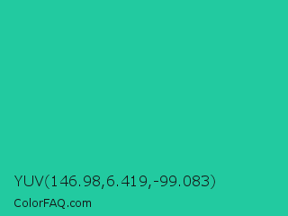 YUV 146.98,6.419,-99.083 Color is a normal cyan color and the nearest color is Shamrock #33cc99. Hex code #22caa0 and RGB value is rgb(34,202,160). In RGB color space, this color is composed of 13% red, 79% green, 63% blue, In CMYK color space, this color is composed of 83% cyan, 0% magenta, 21% yellow , 21% black , In HSL color space, this color has a hue angle of 165° , 71% saturation and 46% lightness.