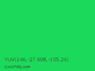 YUV 146,-27.608,-105.24 Color is a normal green color and the nearest color is Malachite #0bda51. Hex code #1ada5a and RGB value is rgb(26,218,90). In RGB color space, this color is composed of 10% red, 85% green, 35% blue, In CMYK color space, this color is composed of 88% cyan, 0% magenta, 59% yellow , 15% black , In HSL color space, this color has a hue angle of 140° , 79% saturation and 48% lightness.