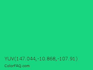 YUV 147.044,-10.868,-107.91 Color is a normal green color and the nearest color is Mountain Meadow Crayola #1ab385. Hex code #18d67d and RGB value is rgb(24,214,125). In RGB color space, this color is composed of 9% red, 84% green, 49% blue, In CMYK color space, this color is composed of 89% cyan, 0% magenta, 42% yellow , 16% black , In HSL color space, this color has a hue angle of 152° , 80% saturation and 47% lightness.