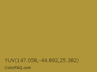 YUV 147.058,-44.892,25.382 Color is a normal yellow color and the nearest color is Alpine #af8f2c. Hex code #b09638 and RGB value is rgb(176,150,56). In RGB color space, this color is composed of 69% red, 59% green, 22% blue, In CMYK color space, this color is composed of 0% cyan, 15% magenta, 68% yellow , 31% black , In HSL color space, this color has a hue angle of 47° , 52% saturation and 45% lightness.