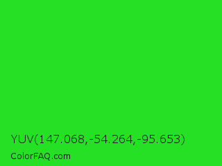 YUV 147.068,-54.264,-95.653 Color is a normal green color and the nearest color is Lime Green #32cd32. Hex code #26e025 and RGB value is rgb(38,224,37). In RGB color space, this color is composed of 15% red, 88% green, 15% blue, In CMYK color space, this color is composed of 83% cyan, 0% magenta, 83% yellow , 12% black , In HSL color space, this color has a hue angle of 120° , 75% saturation and 51% lightness.