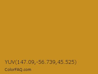 YUV 147.09,-56.739,45.525 Color is a normal orange color and the nearest color is Nugget #c59922. Hex code #c78f20 and RGB value is rgb(199,143,32). In RGB color space, this color is composed of 78% red, 56% green, 13% blue, In CMYK color space, this color is composed of 0% cyan, 28% magenta, 84% yellow , 22% black , In HSL color space, this color has a hue angle of 40° , 72% saturation and 45% lightness.