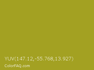 YUV 147.12,-55.768,13.927 Color is a normal yellow color and the nearest color is Citron #9fa91f. Hex code #a3a122 and RGB value is rgb(163,161,34). In RGB color space, this color is composed of 64% red, 63% green, 13% blue, In CMYK color space, this color is composed of 0% cyan, 1% magenta, 79% yellow , 36% black , In HSL color space, this color has a hue angle of 59° , 65% saturation and 39% lightness.