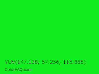 YUV 147.138,-57.256,-115.885 Color is a normal green color and the nearest color is Green #00ff00. Hex code #0fed1f and RGB value is rgb(15,237,31). In RGB color space, this color is composed of 6% red, 93% green, 12% blue, In CMYK color space, this color is composed of 94% cyan, 0% magenta, 87% yellow , 7% black , In HSL color space, this color has a hue angle of 124° , 88% saturation and 49% lightness.