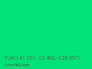YUV 147.157,-12.402,-129.057 Color is a normal green color and the nearest color is Spring Green #00ff7f. Hex code #00e37a and RGB value is rgb(0,227,122). In RGB color space, this color is composed of 0% red, 89% green, 48% blue, In CMYK color space, this color is composed of 100% cyan, 0% magenta, 46% yellow , 11% black , In HSL color space, this color has a hue angle of 152° , 100% saturation and 45% lightness.