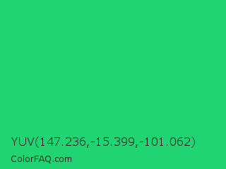 YUV 147.236,-15.399,-101.062 Color is a normal green color and the nearest color is UFO Green #3cd070. Hex code #20d474 and RGB value is rgb(32,212,116). In RGB color space, this color is composed of 13% red, 83% green, 45% blue, In CMYK color space, this color is composed of 85% cyan, 0% magenta, 45% yellow , 17% black , In HSL color space, this color has a hue angle of 148° , 74% saturation and 48% lightness.
