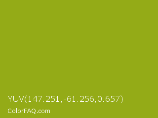 YUV 147.251,-61.256,0.657 Color is a normal yellow color and the nearest color is Citron #9fa91f. Hex code #94ab17 and RGB value is rgb(148,171,23). In RGB color space, this color is composed of 58% red, 67% green, 9% blue, In CMYK color space, this color is composed of 13% cyan, 0% magenta, 87% yellow , 33% black , In HSL color space, this color has a hue angle of 69° , 76% saturation and 38% lightness.