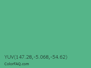 YUV 147.28,-5.068,-54.62 Color is a normal green color and the nearest color is Silver Tree #66b58f. Hex code #55b589 and RGB value is rgb(85,181,137). In RGB color space, this color is composed of 33% red, 71% green, 54% blue, In CMYK color space, this color is composed of 53% cyan, 0% magenta, 24% yellow , 29% black , In HSL color space, this color has a hue angle of 153° , 39% saturation and 52% lightness.