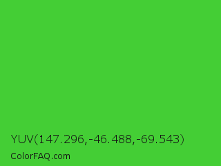 YUV 147.296,-46.488,-69.543 Color is a normal green color and the nearest color is Lime Green #32cd32. Hex code #44ce35 and RGB value is rgb(68,206,53). In RGB color space, this color is composed of 27% red, 81% green, 21% blue, In CMYK color space, this color is composed of 67% cyan, 0% magenta, 74% yellow , 19% black , In HSL color space, this color has a hue angle of 114° , 61% saturation and 51% lightness.