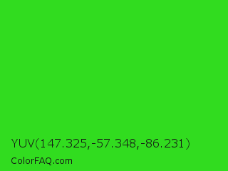 YUV 147.325,-57.348,-86.231 Color is a normal green color and the nearest color is Lime Green #32cd32. Hex code #31dc1f and RGB value is rgb(49,220,31). In RGB color space, this color is composed of 19% red, 86% green, 12% blue, In CMYK color space, this color is composed of 78% cyan, 0% magenta, 86% yellow , 14% black , In HSL color space, this color has a hue angle of 114° , 75% saturation and 49% lightness.