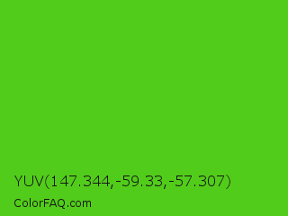 YUV 147.344,-59.33,-57.307 Color is a normal green color and the nearest color is Harlequin Green #46cb18. Hex code #52cc1b and RGB value is rgb(82,204,27). In RGB color space, this color is composed of 32% red, 80% green, 11% blue, In CMYK color space, this color is composed of 60% cyan, 0% magenta, 87% yellow , 20% black , In HSL color space, this color has a hue angle of 101° , 77% saturation and 45% lightness.