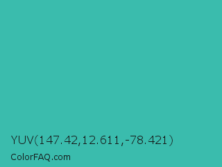 YUV 147.42,12.611,-78.421 Color is a normal cyan color and the nearest color is Puerto Rico #3fc1aa. Hex code #3abcad and RGB value is rgb(58,188,173). In RGB color space, this color is composed of 23% red, 74% green, 68% blue, In CMYK color space, this color is composed of 69% cyan, 0% magenta, 8% yellow , 26% black , In HSL color space, this color has a hue angle of 173° , 53% saturation and 48% lightness.