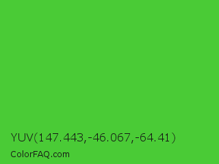YUV 147.443,-46.067,-64.41 Color is a normal green color and the nearest color is Lime Green #32cd32. Hex code #4acb36 and RGB value is rgb(74,203,54). In RGB color space, this color is composed of 29% red, 80% green, 21% blue, In CMYK color space, this color is composed of 64% cyan, 0% magenta, 73% yellow , 20% black , In HSL color space, this color has a hue angle of 112° , 59% saturation and 50% lightness.