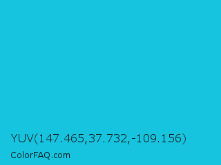 YUV 147.465,37.732,-109.156 Color is a normal cyan color and the nearest color is Scooter #2ebfd4. Hex code #17c4e0 and RGB value is rgb(23,196,224). In RGB color space, this color is composed of 9% red, 77% green, 88% blue, In CMYK color space, this color is composed of 90% cyan, 13% magenta, 0% yellow , 12% black , In HSL color space, this color has a hue angle of 188° , 81% saturation and 48% lightness.