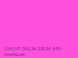 YUV 147.502,36.235,91.645 Color is a light magenta color and the nearest color is Purple Pizzazz #fe4eda. Hex code #fc50dd and RGB value is rgb(252,80,221). In RGB color space, this color is composed of 99% red, 31% green, 87% blue, In CMYK color space, this color is composed of 0% cyan, 68% magenta, 12% yellow , 1% black , In HSL color space, this color has a hue angle of 311° , 97% saturation and 65% lightness.