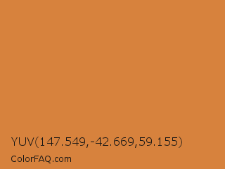 YUV 147.549,-42.669,59.155 Color is a normal orange color and the nearest color is Peru #cd853f. Hex code #d7823d and RGB value is rgb(215,130,61). In RGB color space, this color is composed of 84% red, 51% green, 24% blue, In CMYK color space, this color is composed of 0% cyan, 40% magenta, 72% yellow , 16% black , In HSL color space, this color has a hue angle of 27° , 66% saturation and 54% lightness.
