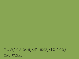 YUV 147.568,-31.832,-10.145 Color is a normal green color and the nearest color is Chelsea Cucumber #83aa5d. Hex code #88a653 and RGB value is rgb(136,166,83). In RGB color space, this color is composed of 53% red, 65% green, 33% blue, In CMYK color space, this color is composed of 18% cyan, 0% magenta, 50% yellow , 35% black , In HSL color space, this color has a hue angle of 82° , 33% saturation and 49% lightness.