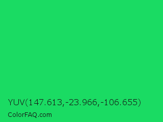 YUV 147.613,-23.966,-106.655 Color is a normal green color and the nearest color is Malachite #0bda51. Hex code #1adb63 and RGB value is rgb(26,219,99). In RGB color space, this color is composed of 10% red, 86% green, 39% blue, In CMYK color space, this color is composed of 88% cyan, 0% magenta, 55% yellow , 14% black , In HSL color space, this color has a hue angle of 143° , 79% saturation and 48% lightness.