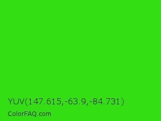 YUV 147.615,-63.9,-84.731 Color is a normal green color and the nearest color is Harlequin Green #46cb18. Hex code #33de12 and RGB value is rgb(51,222,18). In RGB color space, this color is composed of 20% red, 87% green, 7% blue, In CMYK color space, this color is composed of 77% cyan, 0% magenta, 92% yellow , 13% black , In HSL color space, this color has a hue angle of 110° , 85% saturation and 47% lightness.